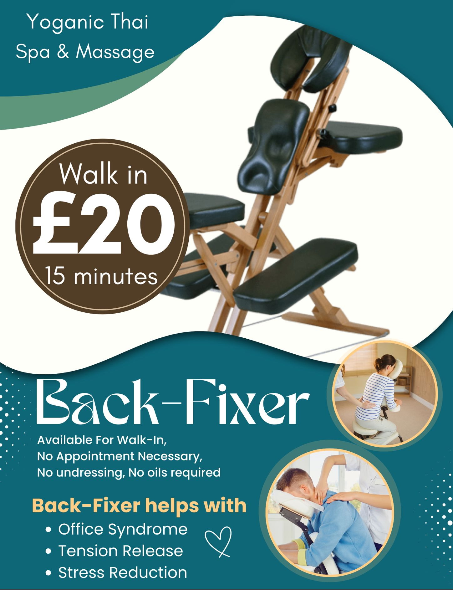 Back Fixer is a fast and effective seated massage on a specially designed chair, focusing on the back, neck, and shoulders. Perfect for those short on time or needing instant relief in targeted areas.